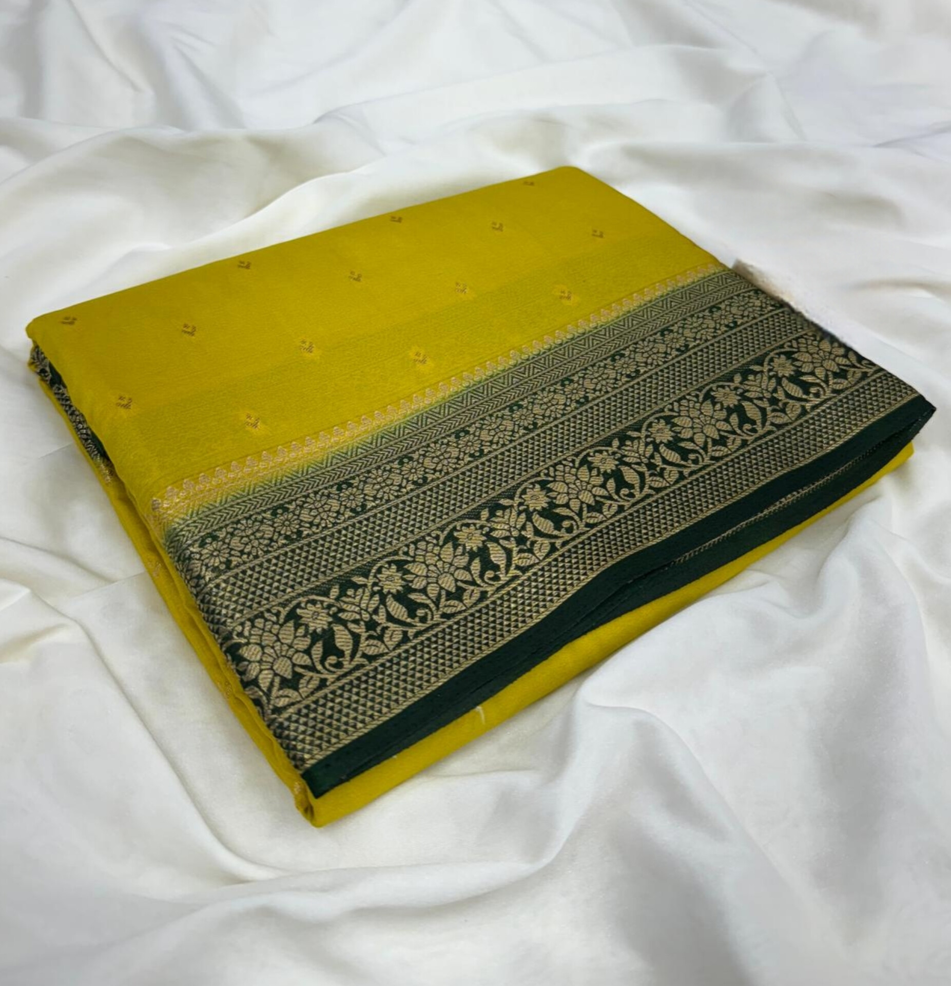Pure grace in Gaji Silk ✨ Featuring a traditional contrast border, rich pallu, and butta blouse that completes the look with heritage charm.