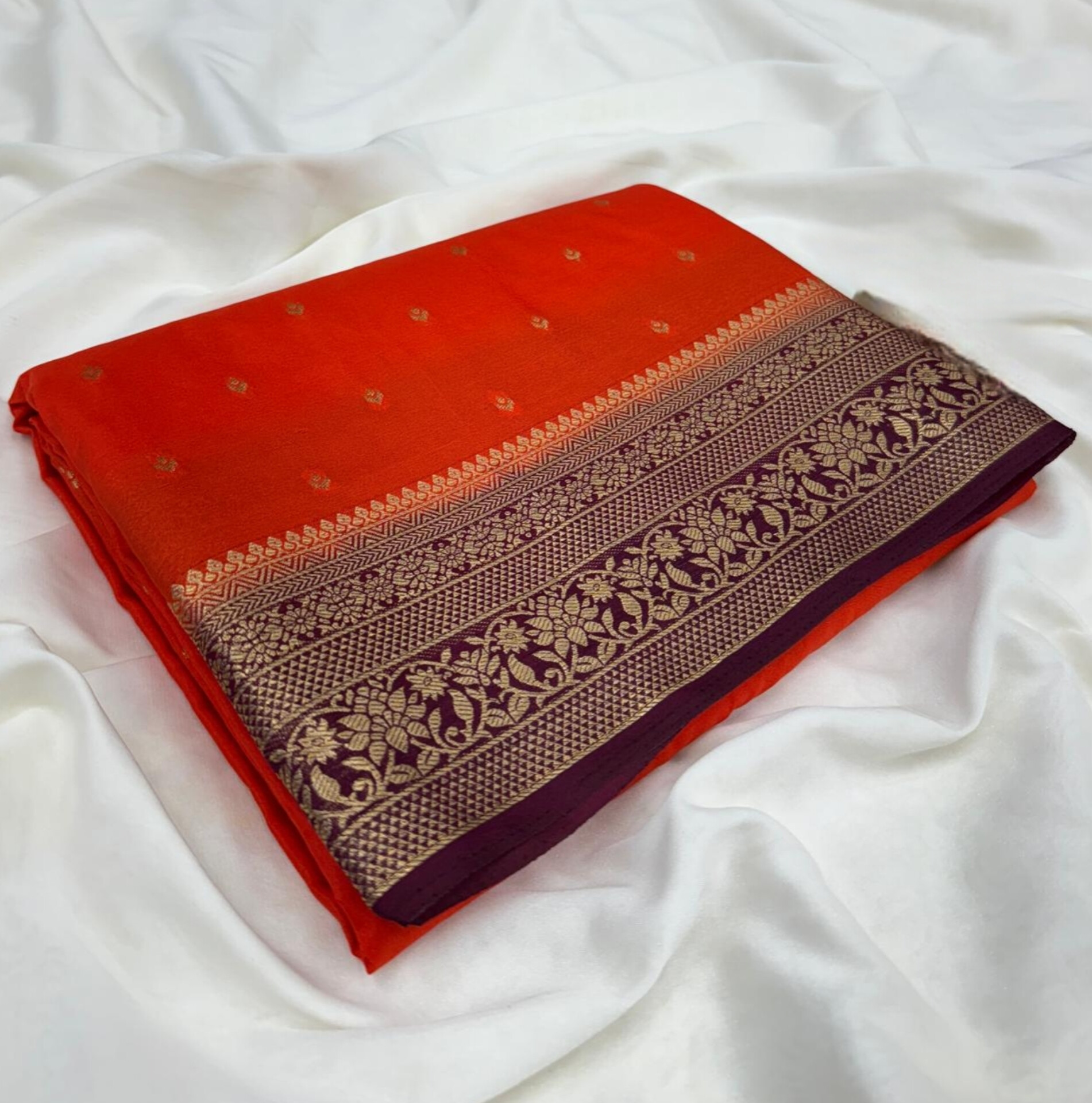 Pure grace in Gaji Silk ✨ Featuring a traditional contrast border, rich pallu, and butta blouse that completes the look with heritage charm.