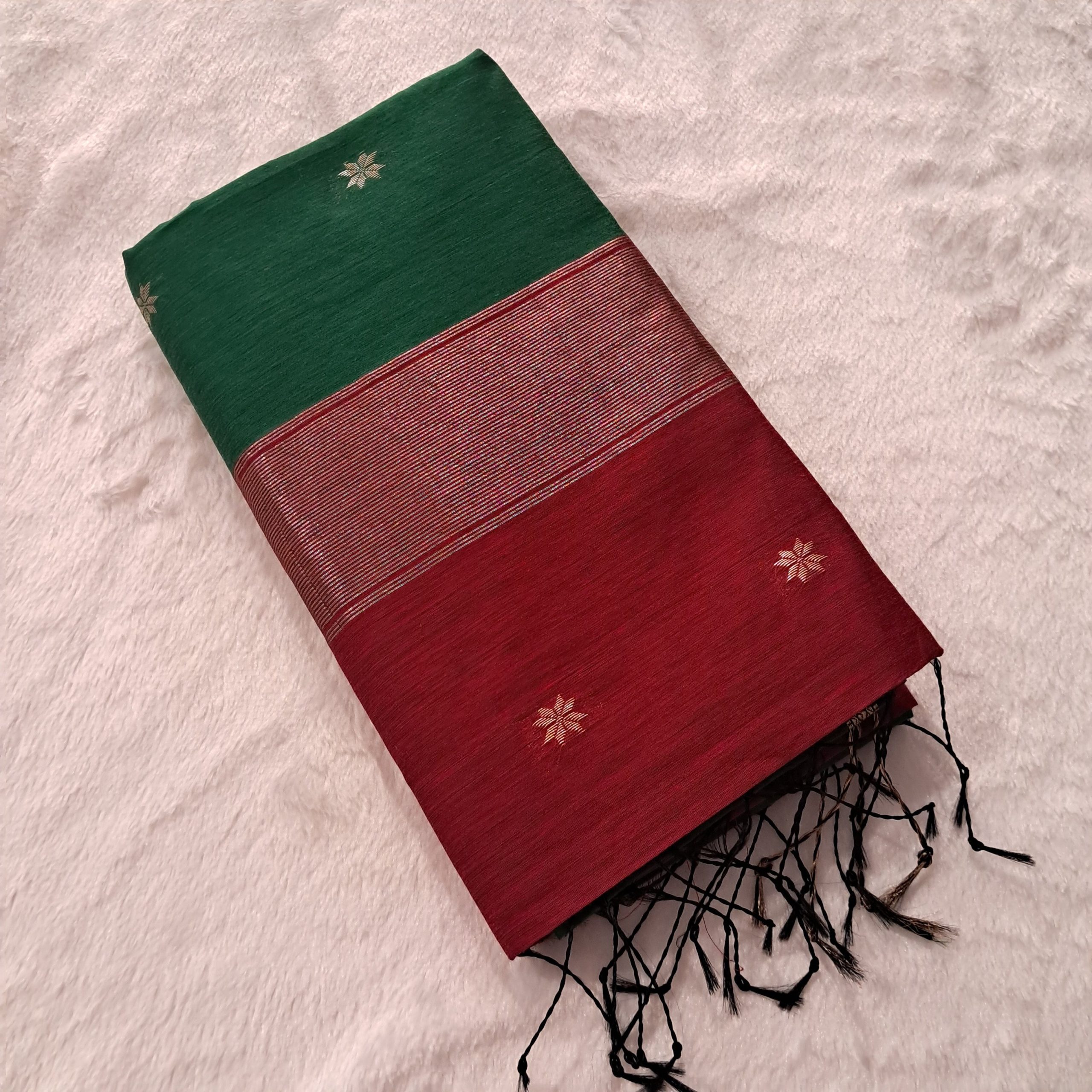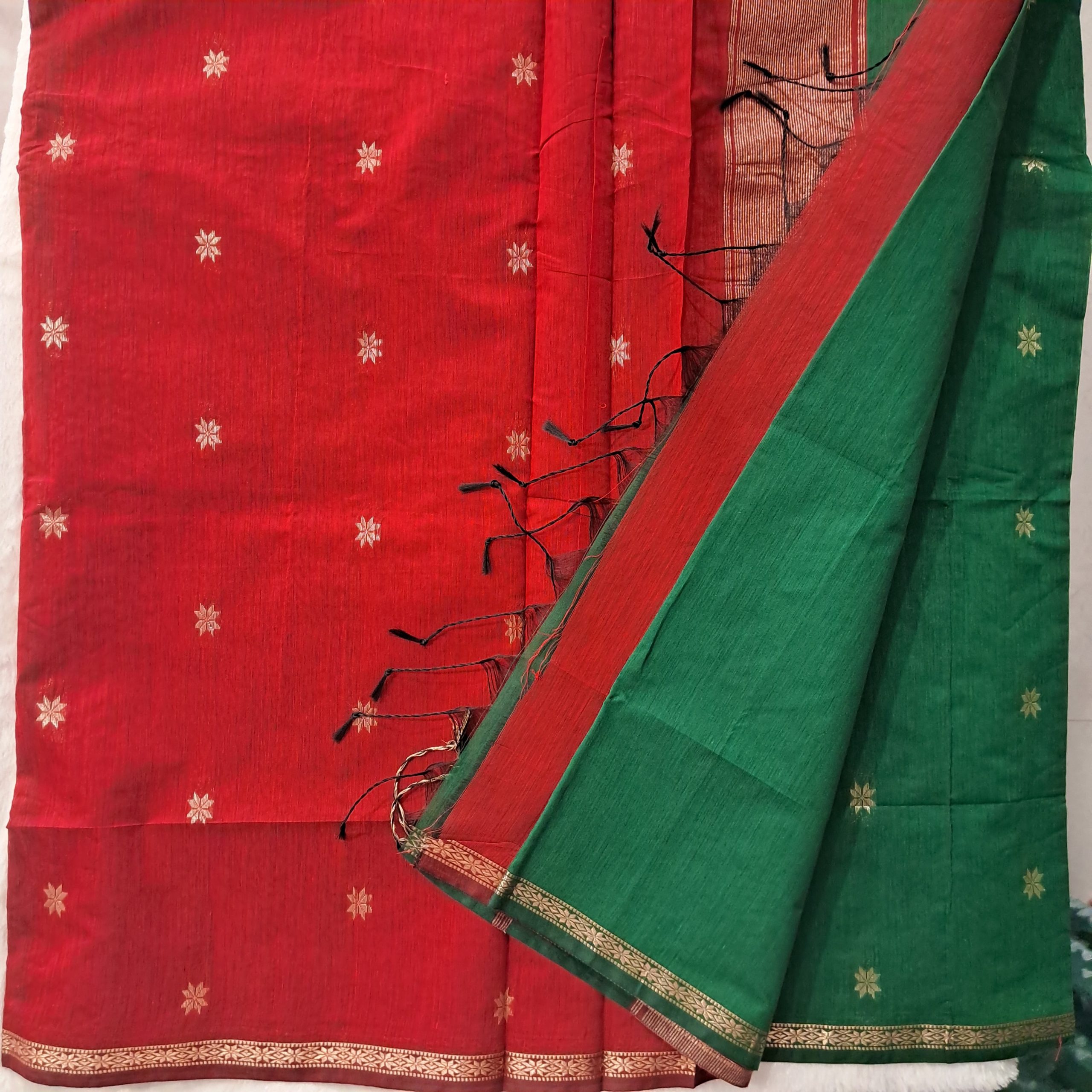 Classic Maheshwari cotton saree adorned with delicate buttas all over — paired with a striking contrast pallu and blouse for that timeless charm.