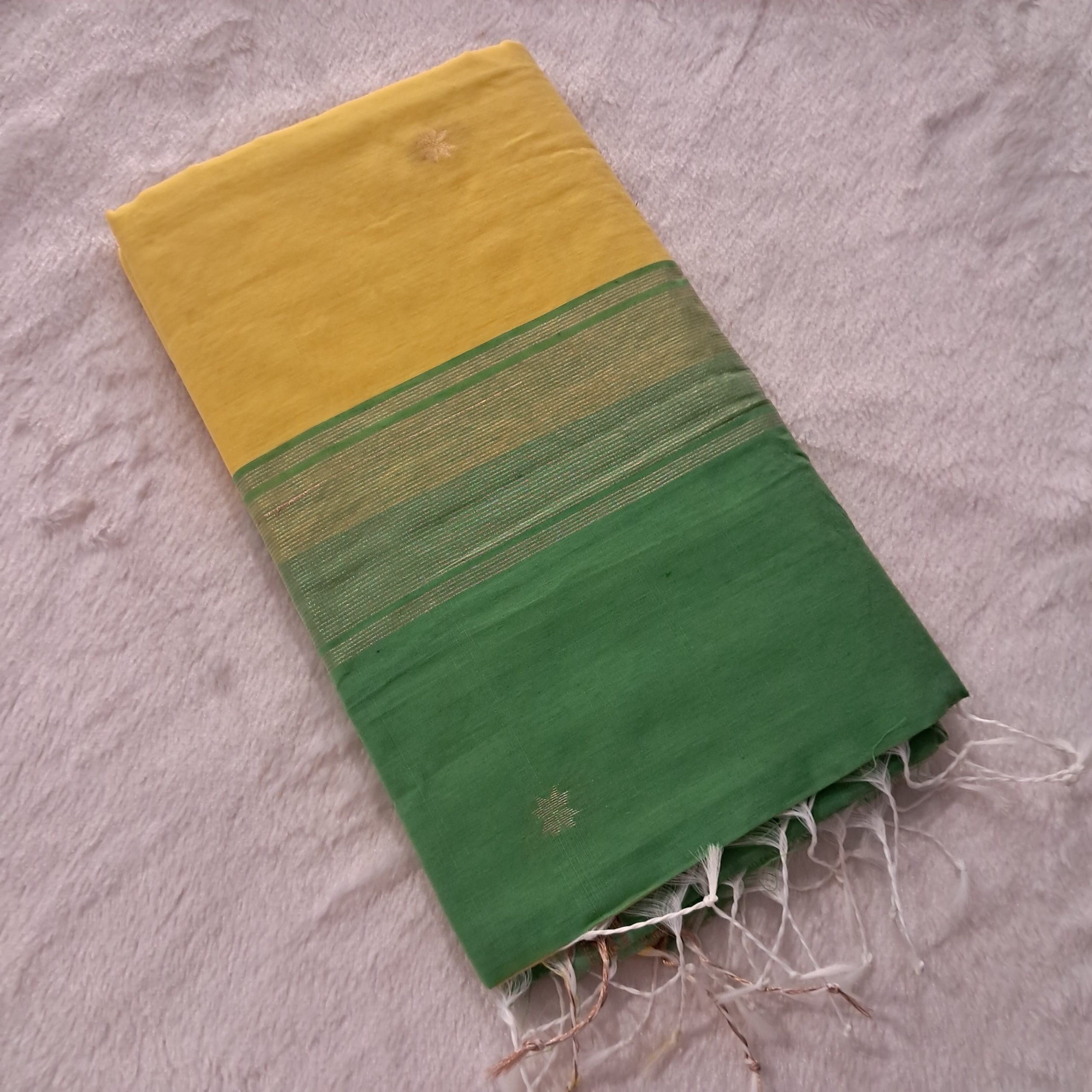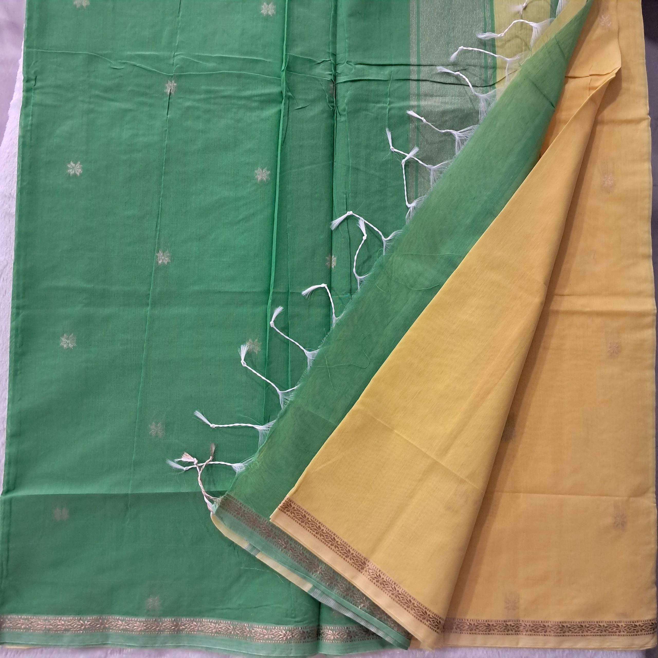 Classic Maheshwari cotton saree adorned with delicate buttas all over — paired with a striking contrast pallu and blouse for that timeless charm.